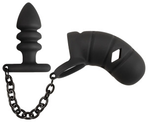 Το κλουβί Cock με το βύσμα από τους Black Velvets που συσσωρεύουν ένα κλουβί cock με ένα δαχτυλίδι μπάλας είναι το οποίο συνδέεται μέσω μιας στιβαρής αλυσίδας με ένα αηδιαστικό πρωκτικό βύσμα. Εκτός από το Great Feel, το Cock Cage παρείχε ένα Aruning Look και Make a Thrilling αξεσουάρ για τον έλεγχο και το Chistity Play. Το πέος εισάγεται στο εύκαμπτο και ανατομικά διαμορφωμένο κλουβί σιλικόνης και οι ελαστικοί δακτύλιοι τραβιούνται πάνω από τους όρχεις, τα πάντα στη θέση τους. Το πρωκτικό βύσμα εισάγεται στον πρωκτό. Η αλυσίδα σύνδεσης παρέχει μια συναρπαστική έλξη και διεγείρει το περίνεο. Το κλουβί ψιλόβροχο, το δαχτυλίδι της μπάλας και το μπλε βύσμα είναι κατασκευασμένα από σιλικόνη που είναι φιλικά προς το δέρμα με απαλή υφή αφής και προσαρμόζονται τέλεια στην ανατομία και την κίνησή σας. Αυτό ισχύει και για την αλυσίδα σταθερής μεταλλικής σύνδεσης. Η αλυσίδα εξασφαλίζει επίσης το βύσμα και εμποδίζει να εμπνεύσει από τον πρωκτό. Το κλουβί cock έχει σχισμές εξαερισμού και ένα άνοιγμα για ούρηση στην ψαλμωδία αυξάνοντας περαιτέρω την ευχαρίστηση αυτού του παιχνιδιού.