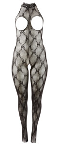 Μαύρη ανοιχτή στολή από λεία δαντέλα με βελονάκι με ιμάντα με Velcro-κλείσιμο διακοπής. Ανοιχτός καβάλος και με το πόδι.